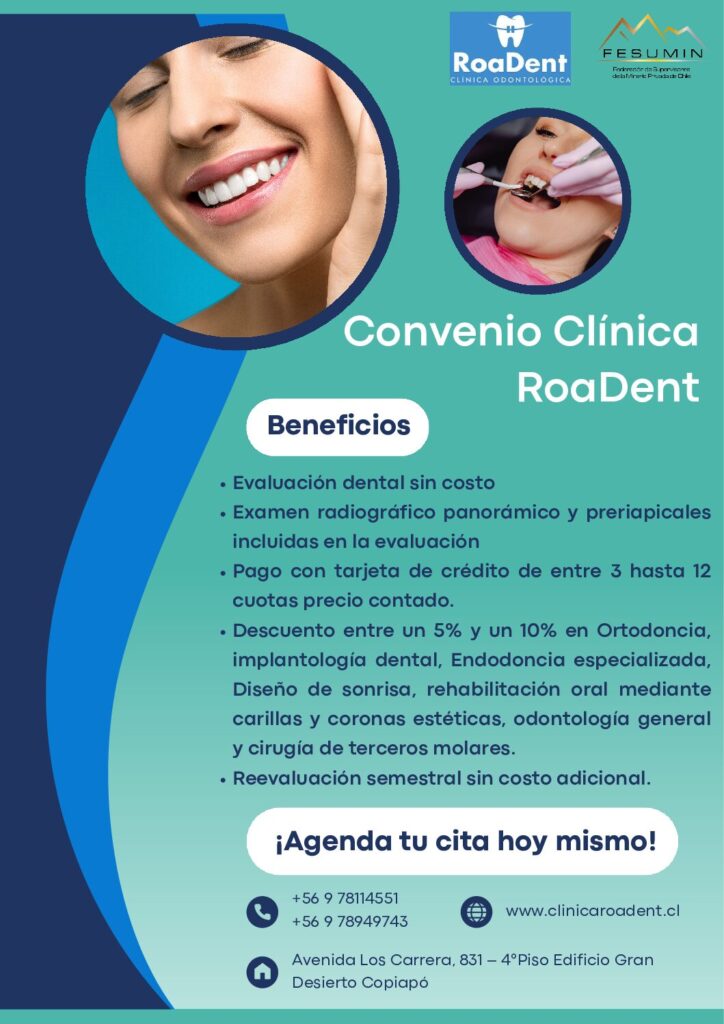 La Clínica Odontológica RoaDent en Copiapó ofrece a los socios de Fesumin y sus familiares directos evaluaciones dentales gratuitas, incluyendo exámenes radiográficos panorámicos y preriapicales. Los tratamientos, que abarcan desde ortodoncia hasta implantología y rehabilitación oral, tienen descuentos del 5% al 10%. Además, se permiten pagos con tarjeta de crédito en cuotas de 3 a 12 meses, y se ofrecen reevaluaciones semestrales sin costo adicional. Para acceder a estos beneficios, contactar a la clínica en Avenida Los Carrera, 831 – 4°Piso Edificio Gran Desierto Copiapó, enviar un correo a [email protected] o [email protected], o llamar al +56 9 78114551, +56 9 78949743, o +56 9 96991271.
