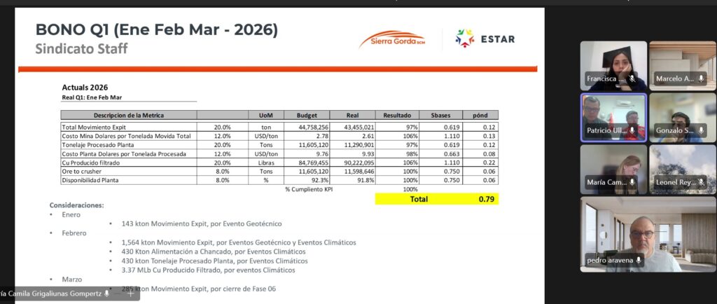 El Sindicato de Supervisores y Staff de Minera Sierra Gorda dio a conocer los resultados del Bono Trimestral de Gestión (BTG) para el periodo enero-marzo de 2026. Tras una reunión con los representantes de la compañía, se confirmó que el cumplimiento de los indicadores clave alcanzó el 100 por ciento, fijando el valor del bono en 0,79.